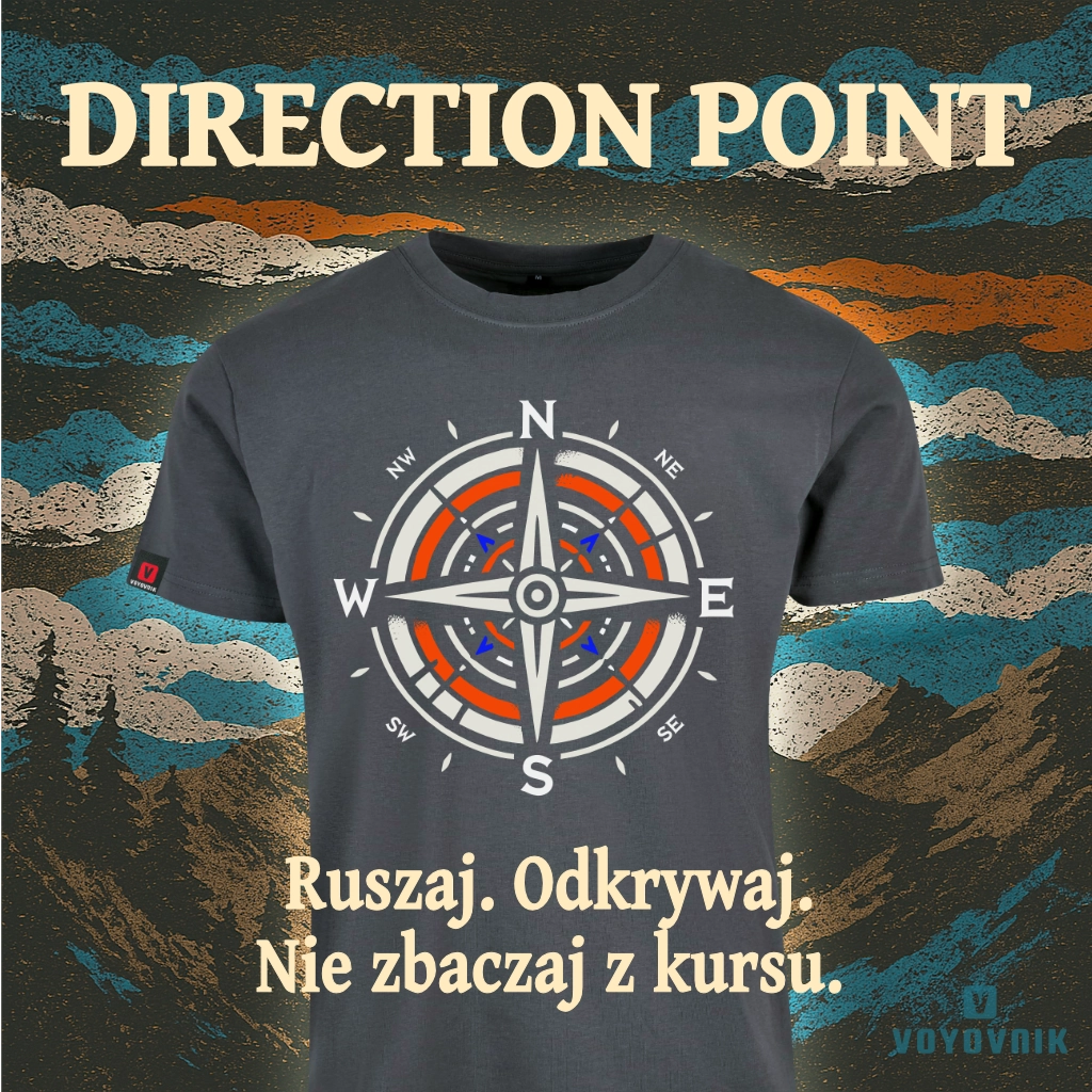 Niezależnie, czy ruszasz na północ, południe, wschód czy zachód – koszulka „Direction Point” zawsze pokazuje, gdzie warto być. Symbol róży wiatrów w nowoczesnym stylu to wizualne przypomnienie, że droga, którą wybierzesz, należy tylko do Ciebie.