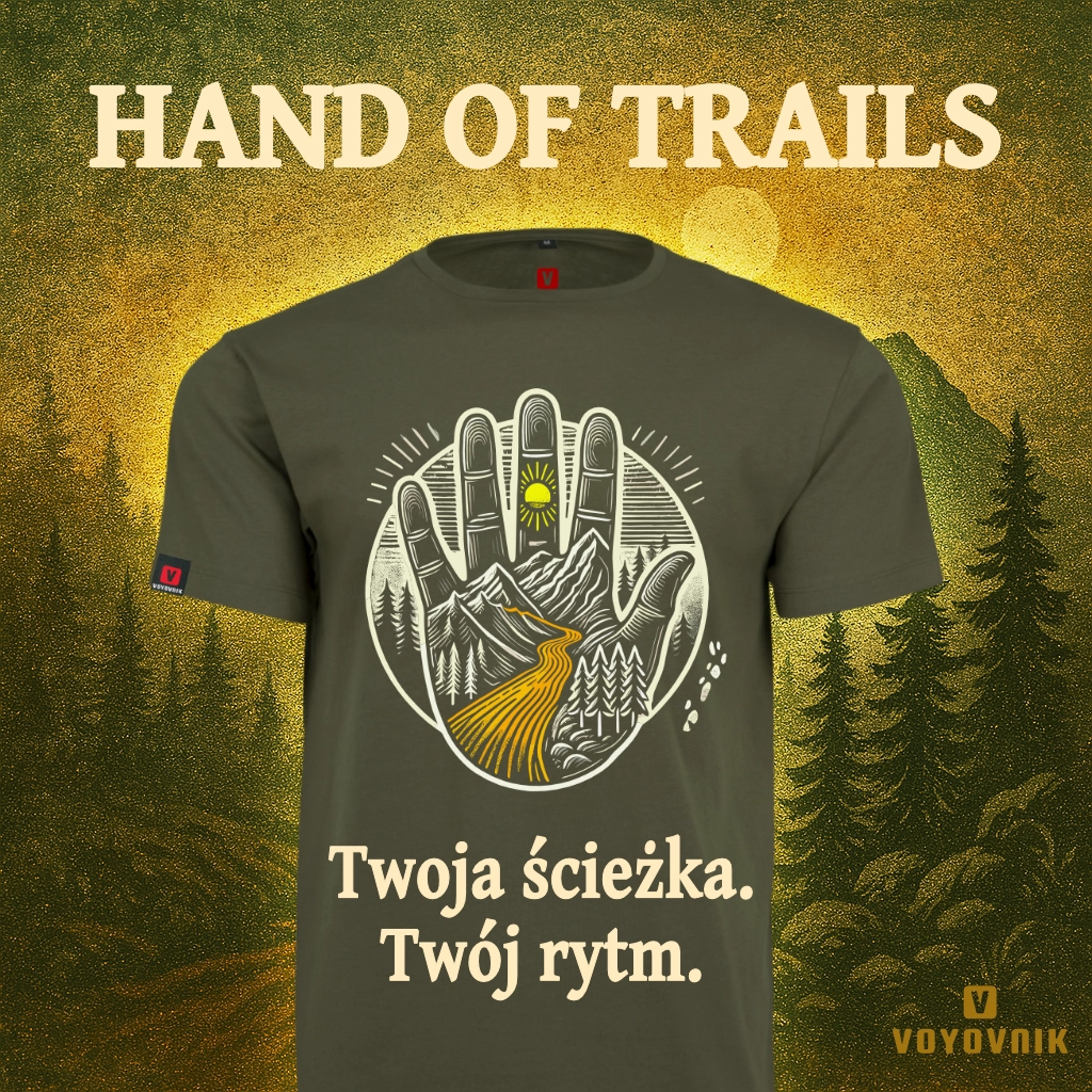 W zarysie dłoni ukryty świat przygody — majestatyczne góry, wijący się szlak i promienie słońca. "Hand of Trails" to graficzna opowieść o tym, że kierunek podróży mamy we własnych rękach.