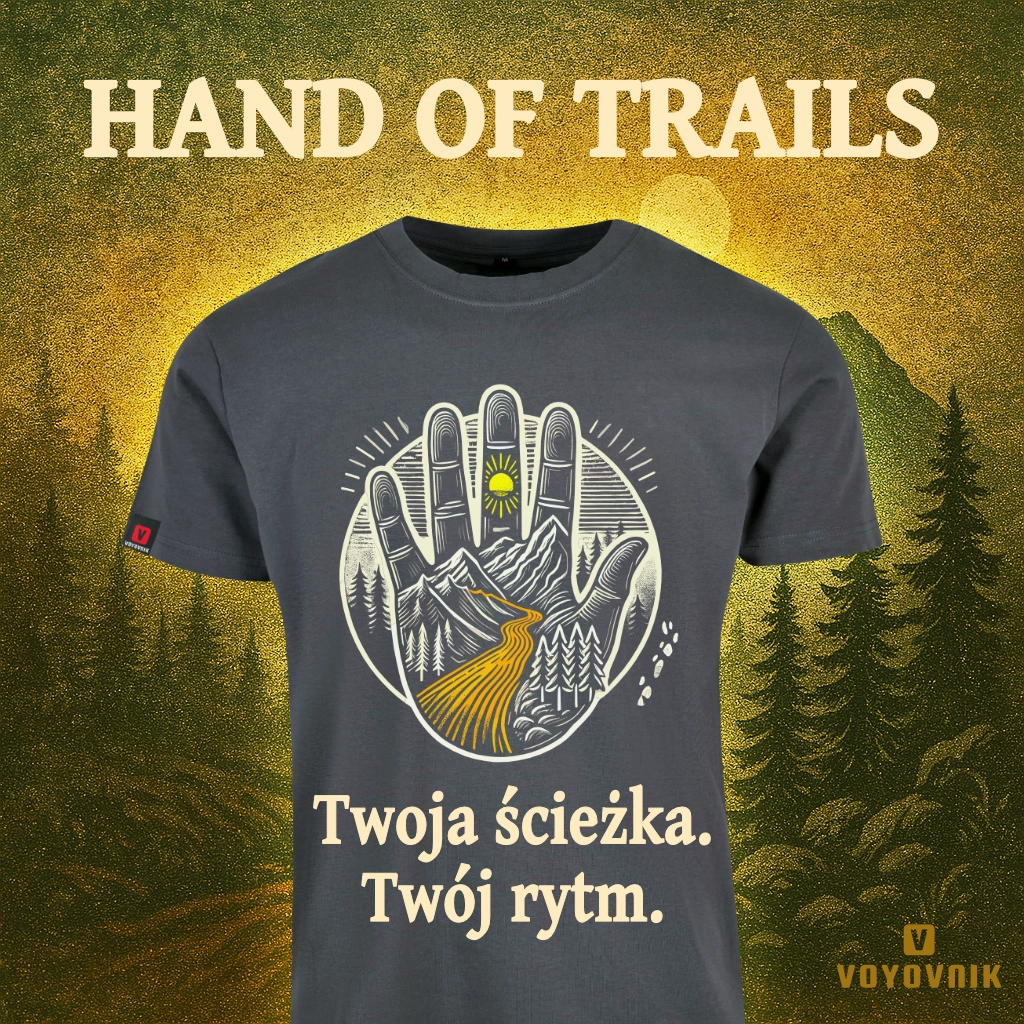 W zarysie dłoni ukryty świat przygody — majestatyczne góry, wijący się szlak i promienie słońca. "Hand of Trails" to graficzna opowieść o tym, że kierunek podróży mamy we własnych rękach.