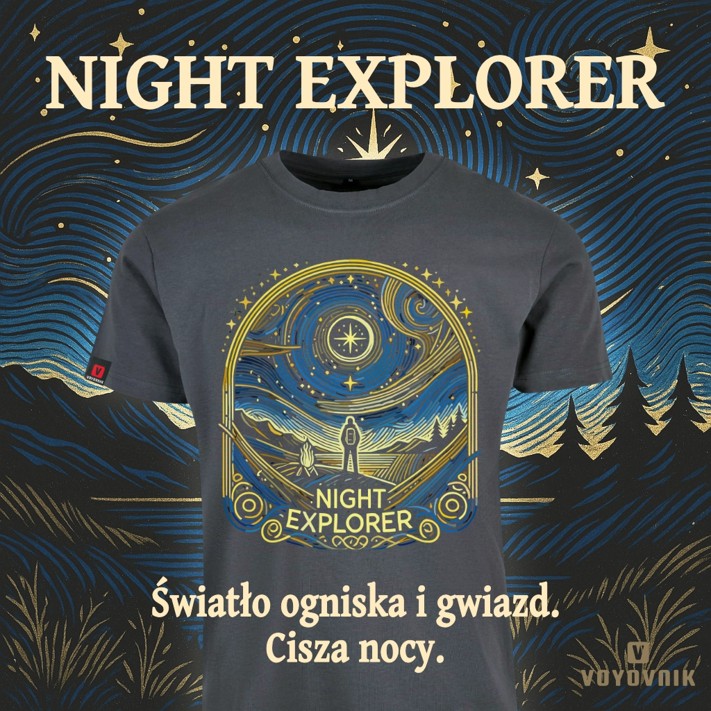 Koszulka „Night Explorer” przyciąga wzrok hipnotyzującymi liniami nieba i żółto-niebieskim światłem nocy. To wzór dla tych, którzy nocne niebo traktują jak mapę do wolności.