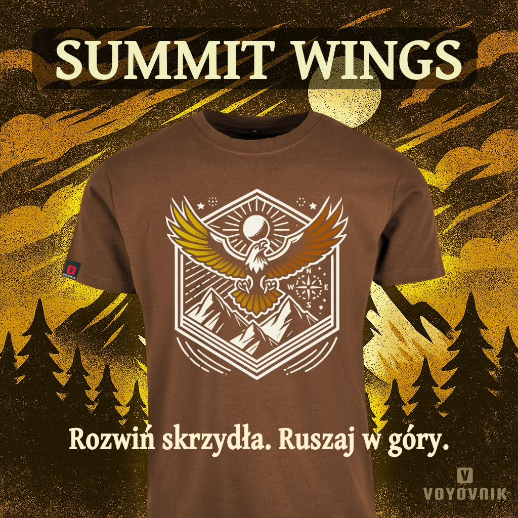 To grafika, która mówi: „Jestem tu, by wznosić się wyżej niż wczoraj”. W tle - ostre szczyty, słońce i gwiazdy. Na pierwszym planie - ptak, który nie zna granic. Idealna koszulka dla każdego pasjonata outdooru, który czuje, że jego kompas bije w rytmie natury.