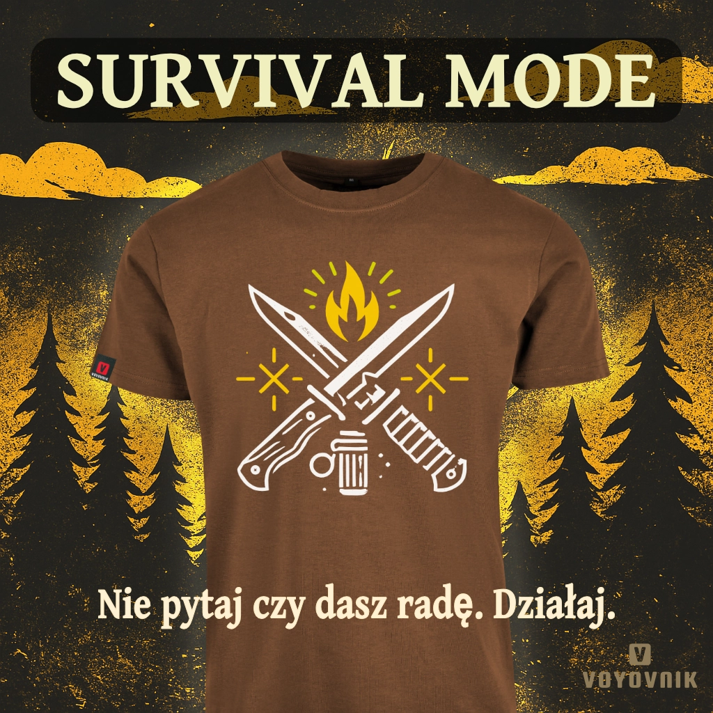 Kiedy liczy się każda sekunda, instynkt przejmuje kontrolę. Koszulka „Survival Mode” przypomina o podstawach przetrwania – ostrze, ogień, krzesiwo i niezłomna wola.