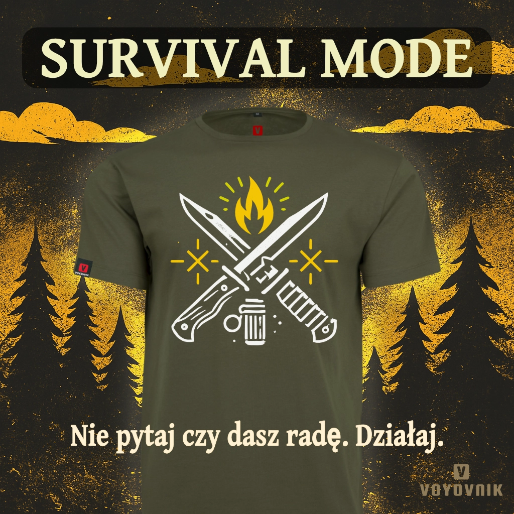 Kiedy liczy się każda sekunda, instynkt przejmuje kontrolę. Koszulka „Survival Mode” przypomina o podstawach przetrwania – ostrze, ogień, krzesiwo i niezłomna wola.